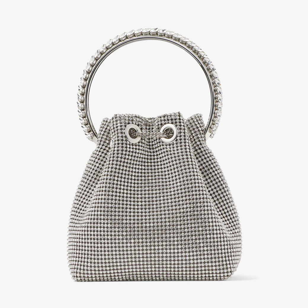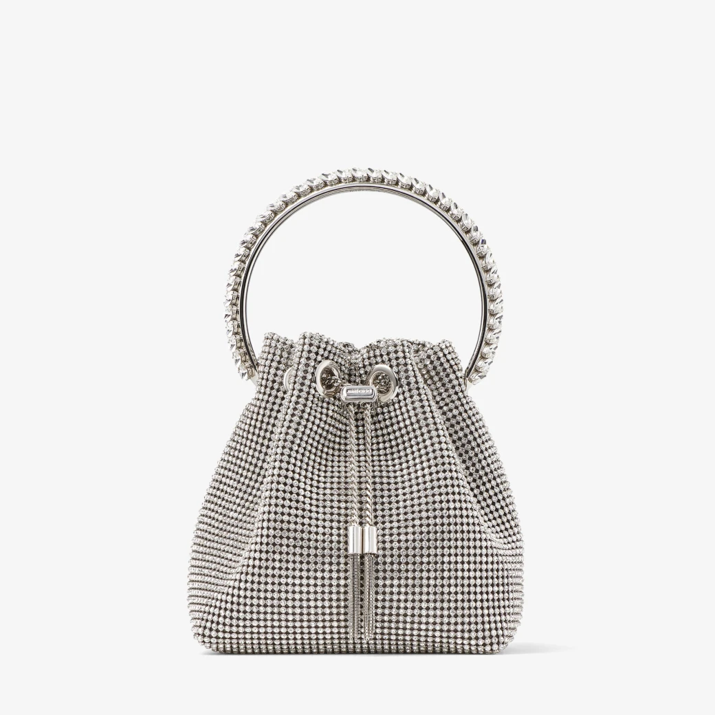 シルバーのサテンクリスタルメッシュを使用した、ジミー チュウのシグネチャーバッグ。きらめくクリスタルのトップハンドルと、しなやかなフォルムを引き締める滑らかなドローストリングチェーンをあしらって、タイムレスに愛用できる存在感あふれるアイテムに仕上げました。あらゆるシーンのコーディネートにマッチするアイテムです。