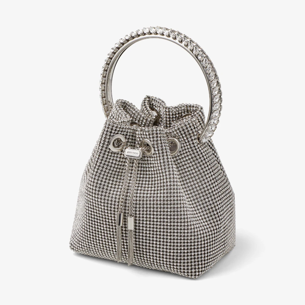 【年に1度のBIGセール!】特別大特価セール!JIMMY CHOO(ジミー チュウ)クリスタルハンドル付き Silver サテンクリスタルメッシュ・バッグ